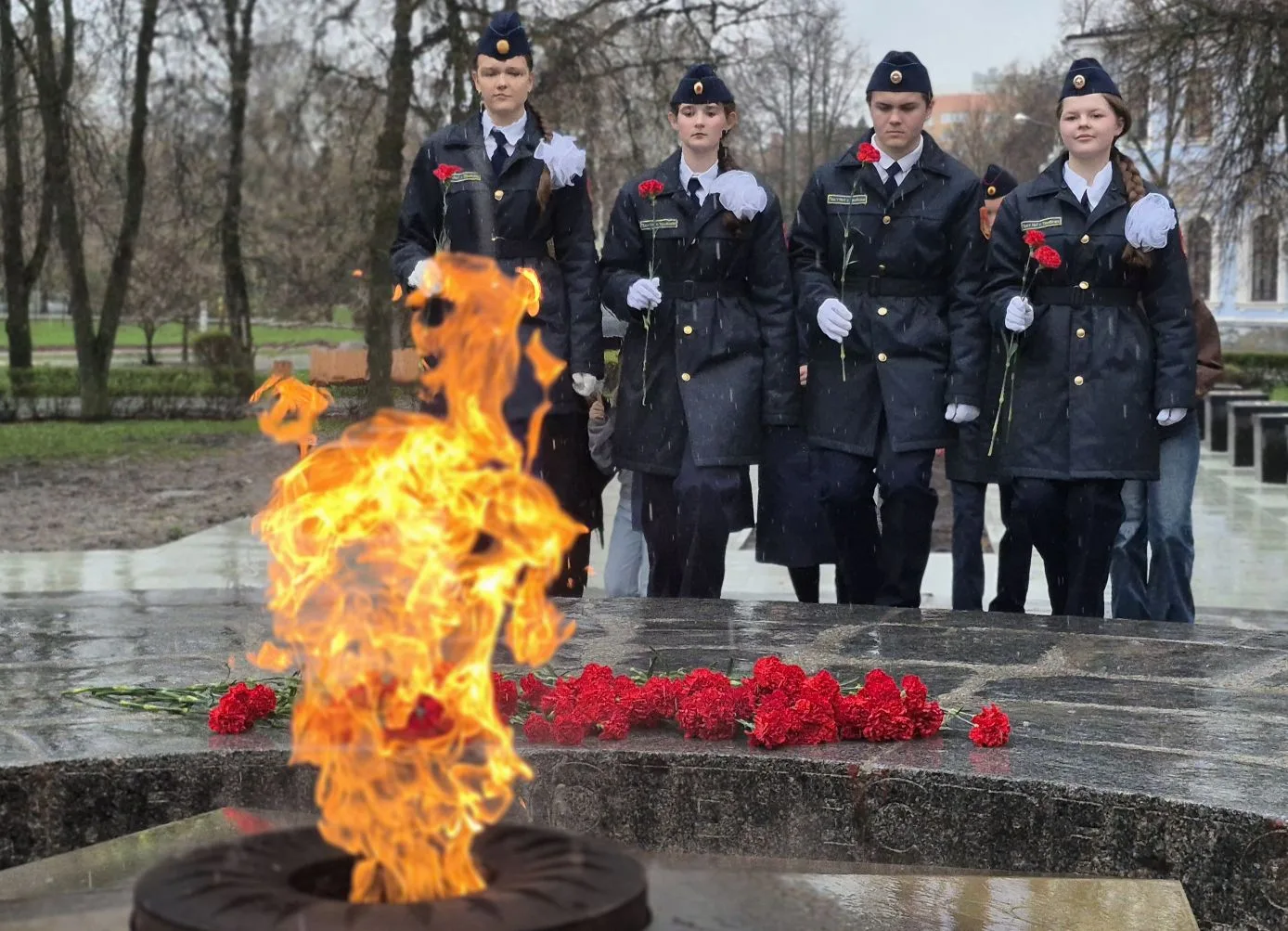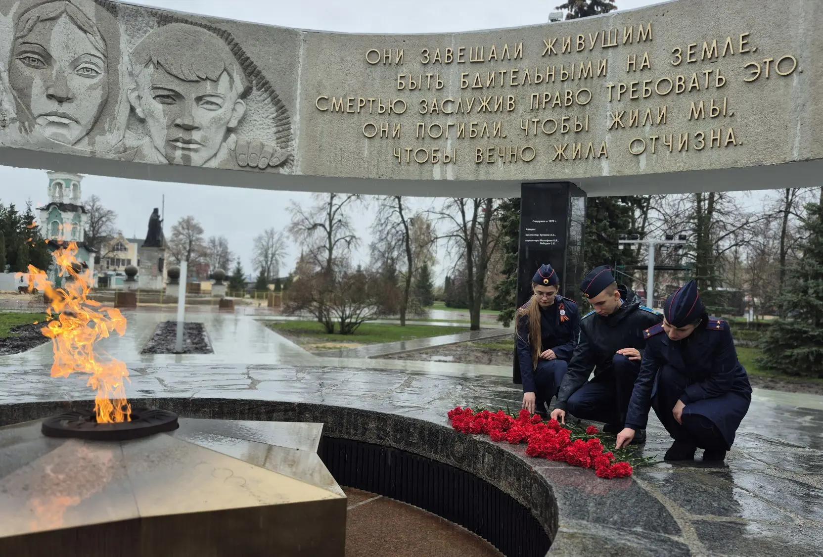 Участники патриотической акции почтили память жертв геноцида советского народа и всех тех, кто ценой своих жизней отстоял свободу и независимость нашей страны, минутой молчания и возложением цветов к мемориалу «Вечный огонь».