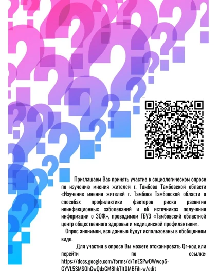 Тамбовский областной центр общественного здоровья и медицинской профилактики предлагает пройти социологический опрос, который позволит изучить мнение жителей о способах профилактики развития неинфекционных заболеваний, а также узнать, из каких источников тамбовчане получают знания о здоровом образе жизни. Опрос, который пройдет с 8 по 30 апреля, проводится в рамках мероприятий, посвященных Всемирному дню здоровья.
