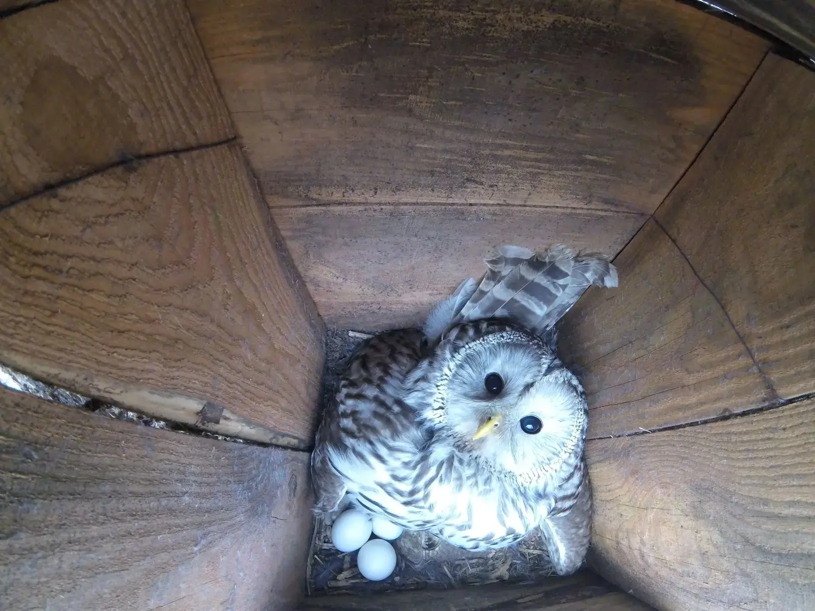 Длиннохвостая неясыть из Центра охраны хищных птиц "Русский сокол" продолжает насиживание кладки из 4 яиц