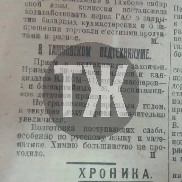 В тамбовский педтехникум по итогам экзаменов поступило 38 человек, в основном все они беспартийные. Комиссия отмечает, что прием увеличился, но подготовка юношей и девушек хромает. Абитуриенты допустили много ошибок в работах по русскому языку и математике. У большинства нет базовых знаний по химии.