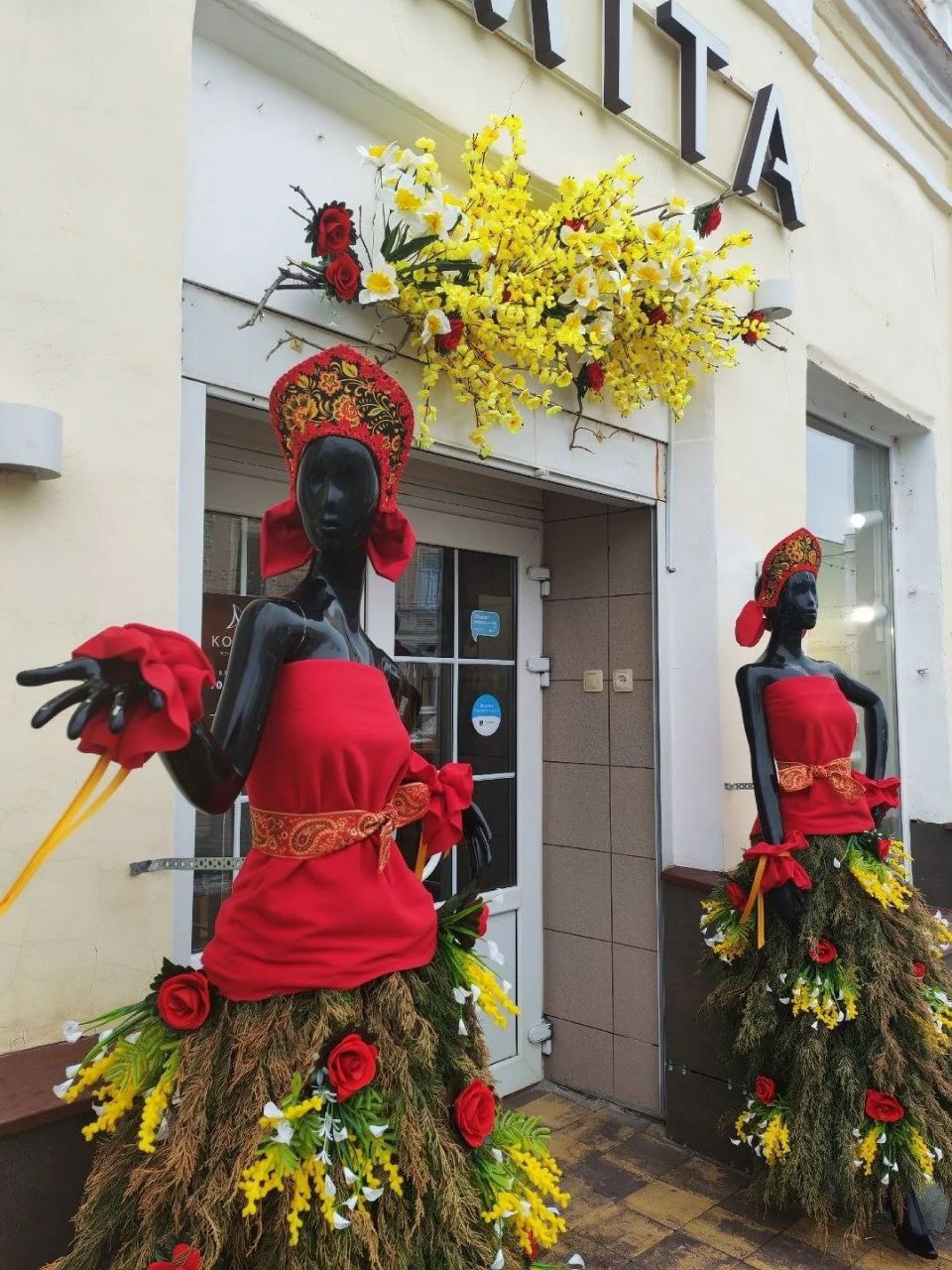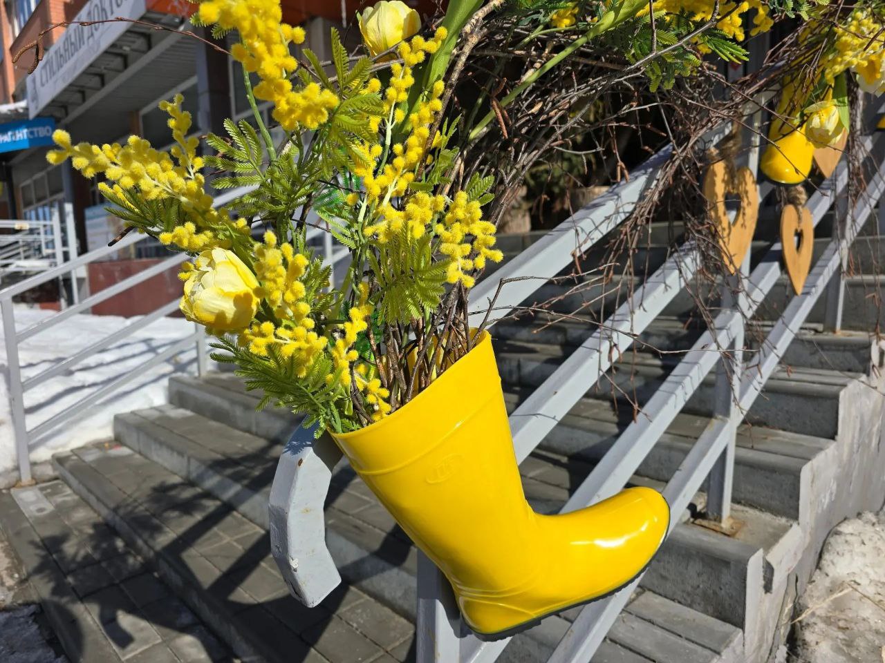На фасадах зданий появляются гирлянды из веток, искусственных цветов, лент и декоративных бабочек, а в витринах — необычные композиции из мимоз, тюльпанов и нарцисов. Некоторые предприниматели проявляют креативность: в декоре можно увидеть даже яркие резиновые сапоги — необычный, но очень колоритный и очаровательный элемент.