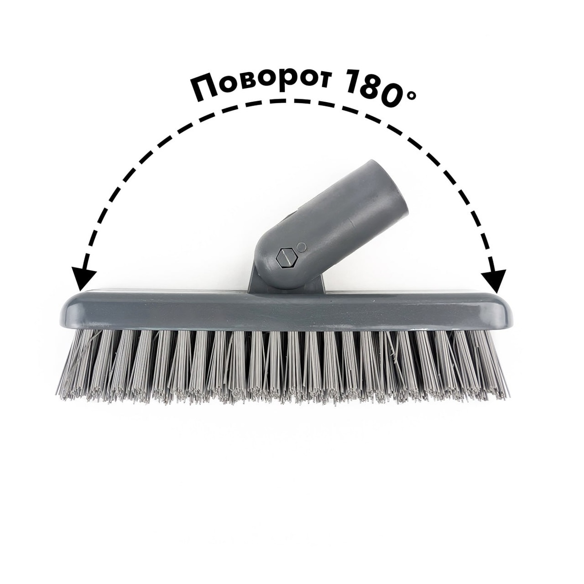 Щетка значительно упрощает процесс уборки благодаря совместимости с любой рукояткой, имеющей американскую резьбу. Регулируемый угол наклона крепления позволяет использовать щетку в различных плоскостях, что особенно удобно при работе в ограниченных пространствах.
