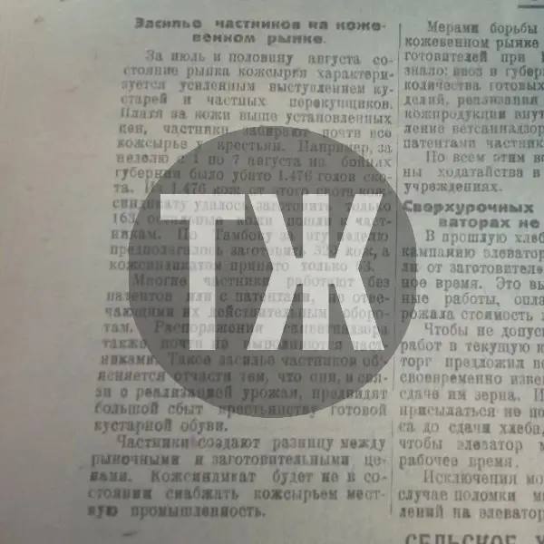 Кустари и частные перекупщики наводнили рынок кожсырья. Они перебивают цены и забирают у крестьян сырье. Таким образом кожсиндикат лишился значительного дохода. За неделю из почти полутора тысяч голов скота, прошедших в губернии через бойни, ему досталось меньше двухсот, доля заготовленных кож ничтожно мала. Снабжение кожсырьем местной промышленности выполняется с перебоями.