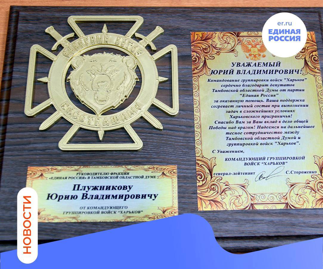 «Командование группировки войск «Харьков» сердечно благодарит депутатов Тамбовской областной Думы от партии «Единая Россия» за оказанную помощь. Ваша поддержка согревает личный состав при выполнении задач в сложнейших условиях Харьковского приграничья! Спасибо Вам за Ваш вклад в дело общей Победы над врагом! Надеемся на дальнейшее тесное сотрудничество между Тамбовской областной Думой и группировкой войск «Харьков».