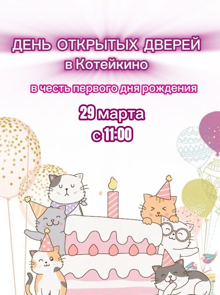 29 марта тамбовское котокафе отмечает первый день рождения. Для всех посетителей организаторы приготовили праздник: новая фотозона для фотосессии с котиками, мастер-классы по уходу за животными, розыгрыш подарков, чай, сладости и хорошее настроение.