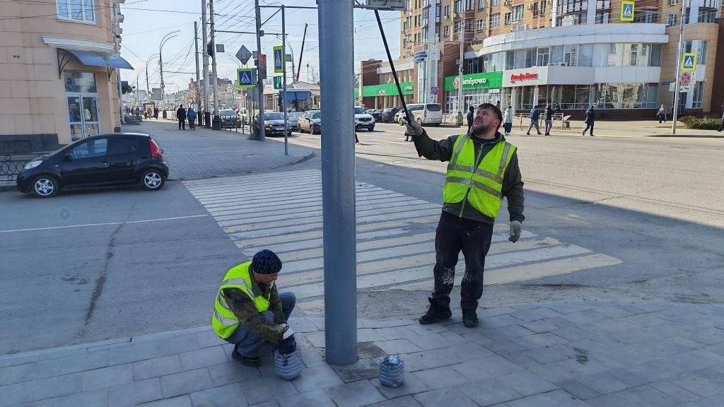 Сегодня коммунальные службы работают сразу по нескольким направлениям. На Интернациональной ремонтируют дорожные знаки, на Советской — восстанавливают пешеходные ограждения и красят опоры, а также моют тротуары.
