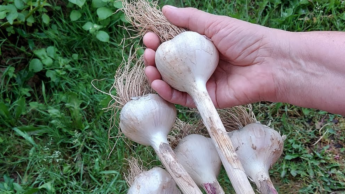 Сигнал к сбору — желтеющие нижние листья и распрямленные стрелки. После выкопки пускай чеснок обсохнет с ботвой в тени, что способствует лучшей сохранности.