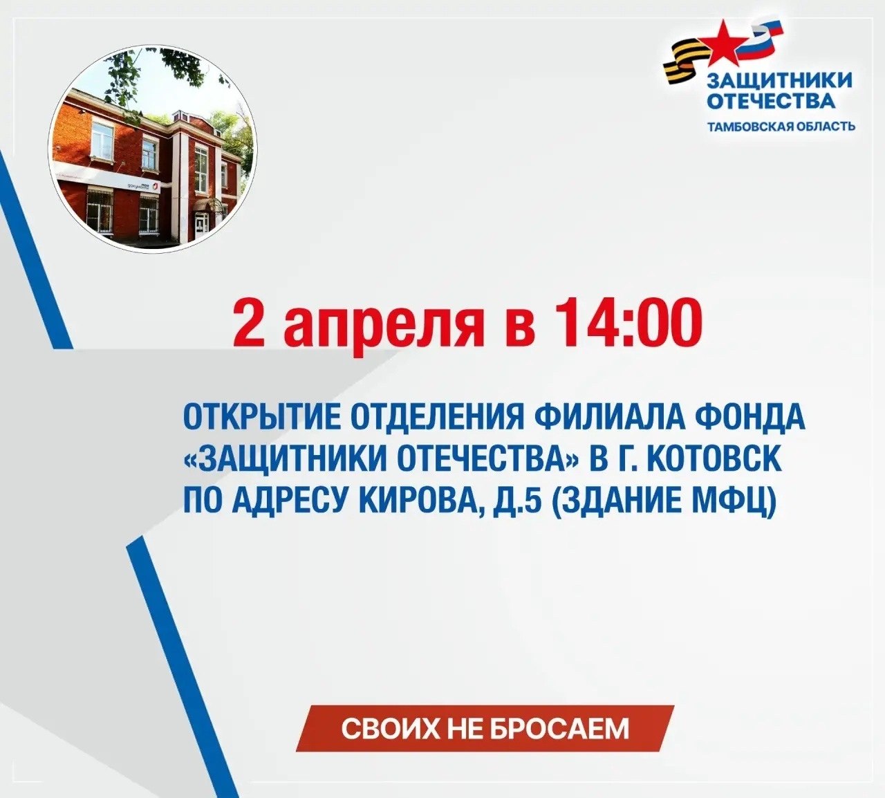 В Котовске откроется филиал фонда поддержки участников СВО «Защитники Отечества» (18+)
