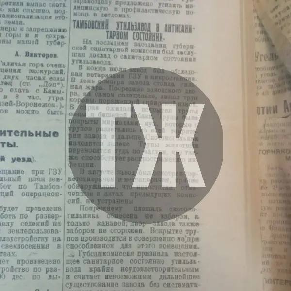 Санитарная комиссия крайне недовольна положением дел на тамбовском утильзаводе. Ветврачи, приехав с проверкой, обнаружили посреди двора на самом солнцепеке труп коровы, пораженной сибирской язвой, а в сараях — трупы овцы и собаки после проведенного вскрытия. Все они были покрыты мухами, которые потом разлетались по окрестным селам и деревням, разнося заразу. На скотомогильник умерших животных доставляли по частям, что также способствовало распространению инфекционных заболеваний.
