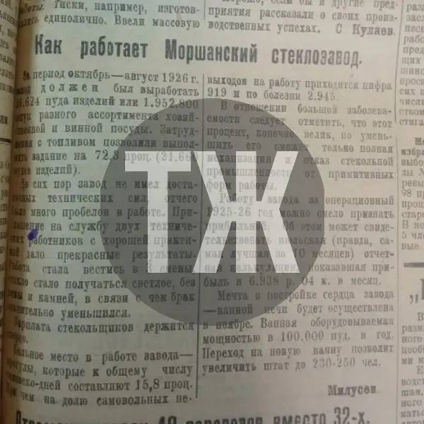 Моршанский стеклозавод переживал трудные времена. Заказов откровенно мало, да еще возникли проблемы с топливом, что привело к резкому снижению производительности. Государственное задание выполнялось лишь на 72 процента. Показатели немного подросли после того, как сюда пригласили двух технических работников с большим опытом. В июле производство дало прибыль в размере почти семи тысяч рублей.