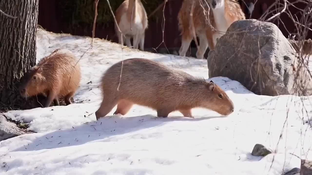 Одними из первых на прогулку вышло семейство капибар. Зверьки с удивлением обнаружили, что сугробы еще не везде растаяли.