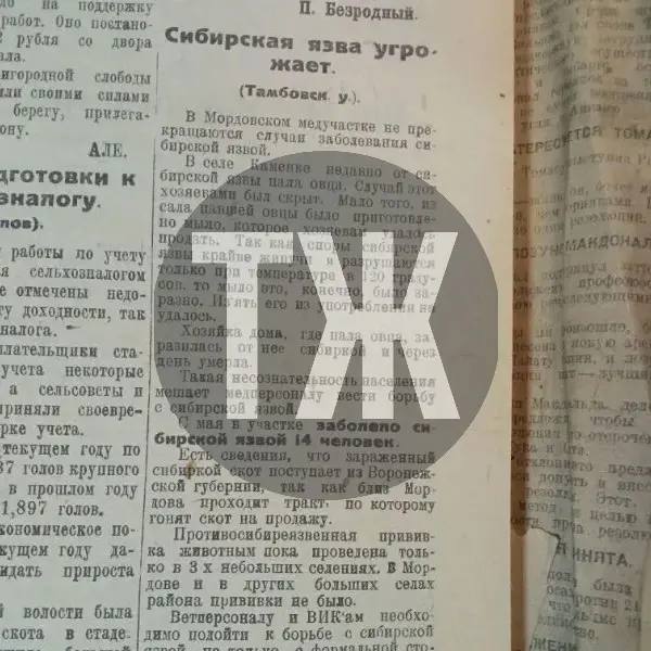 В Тамбовском уезде отмечаются случаи заболевания сибирской язвой. Гибнет скот, заразилось 14 человек. В селе Каменка местные жители не спешат информировать власти о возникшей ситуации. Они всячески скрывают падеж животных. Из сала одной овцы, имевшей все симптомы болезни, сварили мыло и реализовали его на рынке. Хозяйка животного вскоре умерла. Ветврачи сходятся во мнении, что сибирская язва пришла в губернию из Воронеской области. Зараженный скот приобретался там крестьянами на многочисленных ярмарках.