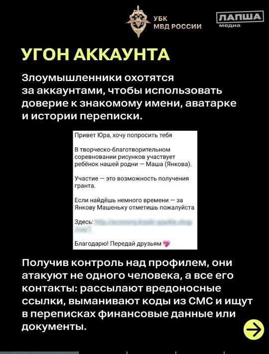 Подробнее о том, какие угрозы могут поджидать пользователей и как от них защититься, читайте в карточках, подготовленных Киберполицией России.