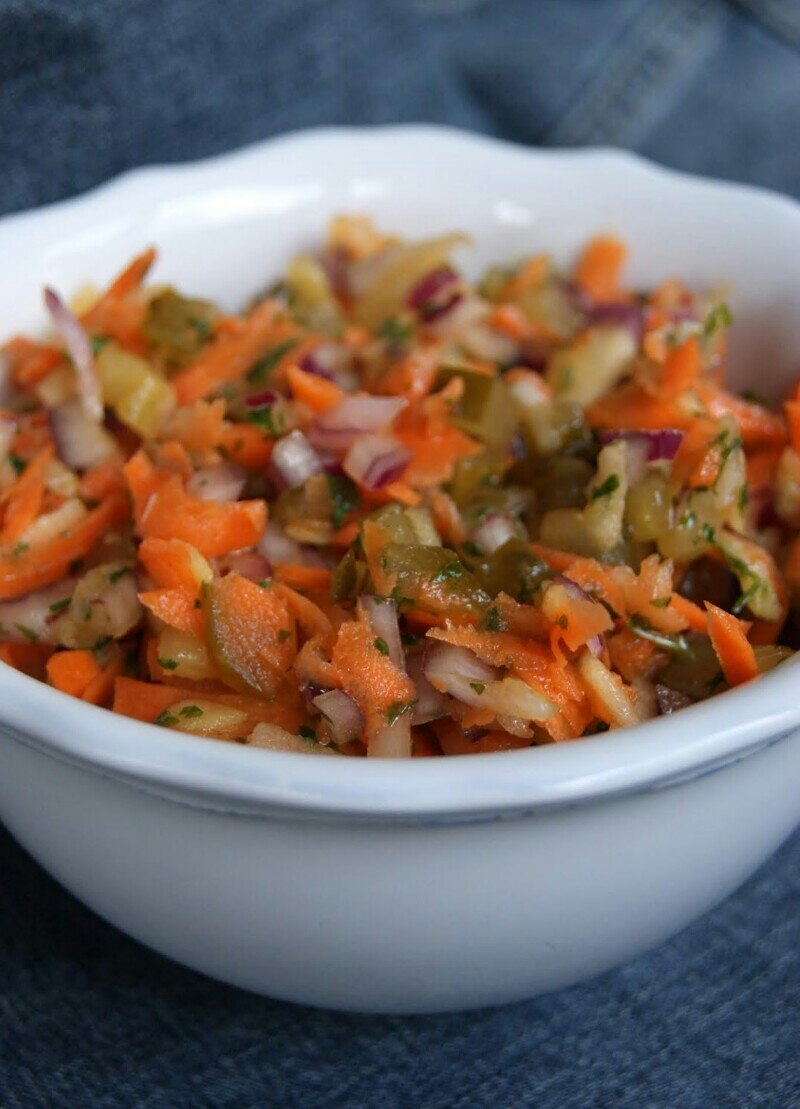Несмотря на легкость, этот блюд остается сытным благодаря наличию моркови, а также маринованных или квашеных огурцов, которые добавляют приятную кислинку и освежающий акцент. Этот салат идеально подходит как для обеда и ужина, так и для завтрака или праздничного стола.