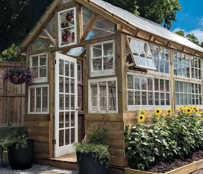 Одна из интересных концепций — теплица, сделанная из старых деревянных обрезков и окон, которые придают ей уникальный шарм. Для крыши идеально подойдут поликарбонатные панели, пропускающие свет и защищающие растения от непогоды. Чтобы завершить образ, можно установить клумбу с яркими сезонными цветами у основания.