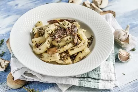 Сначала вскипятите 1,5 литра воды в чайнике и залейте белые грибы 100 мл кипятка, оставшуюся воду переложите в кастрюлю. После этого опустите ригатони в кипящую воду, добавив соль и варите на сильном огне 3 минуты. Не более! Обязательно сохраните один половник воды из-под пасты, а затем откиньте готовую пасту на дуршлаг.
