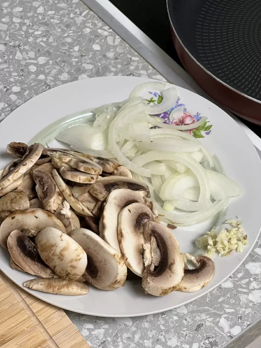 Для начала необходимо мелко нарезать лук, чеснок и шампиньоны. Далее в сковороде разогревается растительное масло, к которому добавляется лук. Обжаривать нужно до появления золотистой корочки. Затем добавляются чеснок и шампиньоны, а также кусочек сливочного масла. Все это обжаривается до появления аппетитного румянца.
