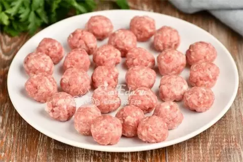 Фарш (200 г) дерутся с солью и перцем, после чего формируются небольшие фрикадельки. Готовые фрикадельки добавить в овощной бульон вместе с предварительно промытым пшеном. Варить около 20 минут. В завершение добавить обильное количество зелени и дать настояться перед подачей.