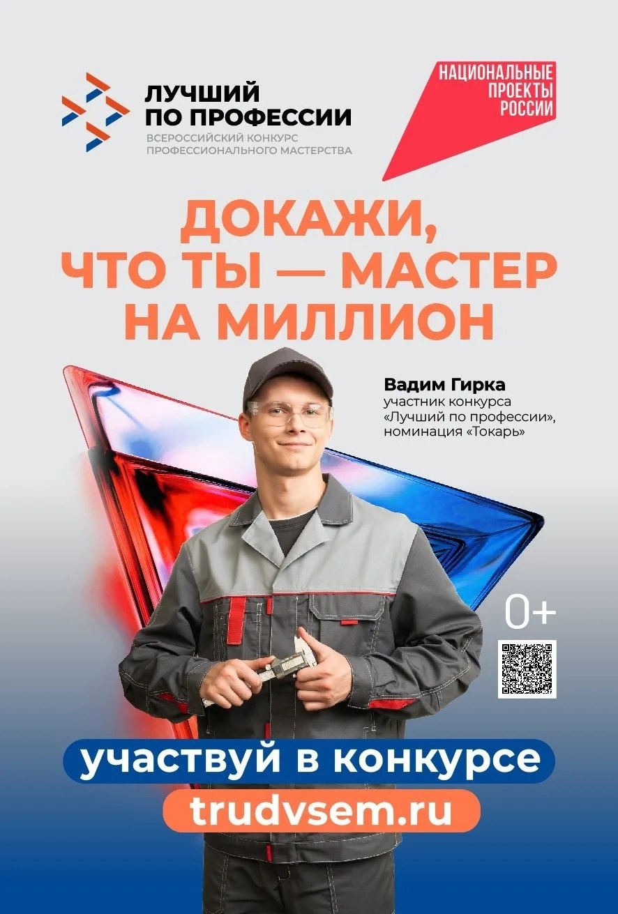 Приглашаем всех, кто гордится своей профессией, принять участие в конкурсе «Лучший по профессии»! Это не просто соревнование — это настоящий праздник мастерства, который ежегодно объединяет тысячи профессионалов по всей стране. Конкурс стал важной частью национального проекта «Кадры» и призван повысить престиж рабочих профессий, показать молодёжи, что быть мастером своего дела — это круто и перспективно.