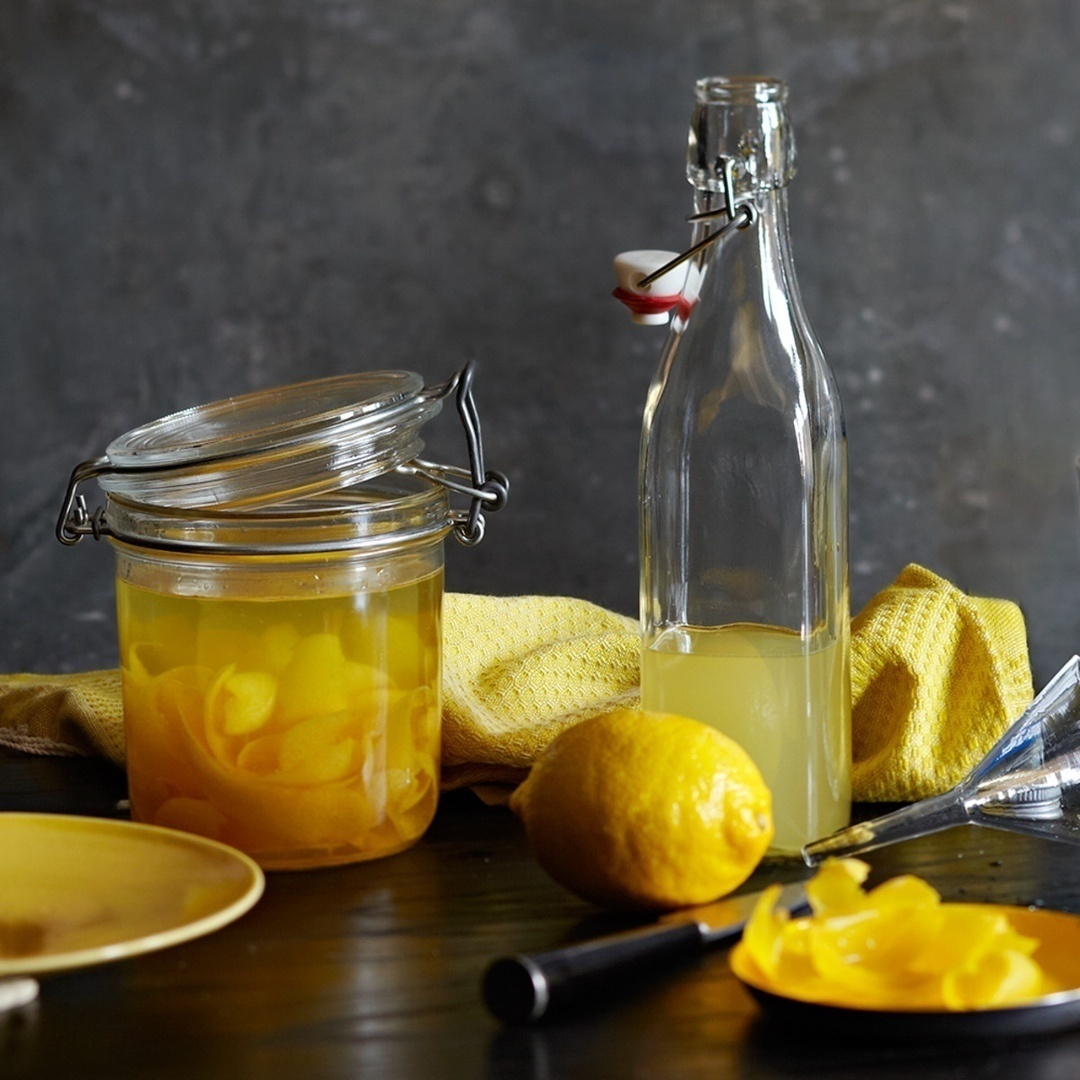 Подготовьте лимоны: тщательно промойте их теплой водой с содой и щеткой для удаления воска. Затем ошпарьте их горячей водой и обсушите. Срежьте цедру с лимонов, избегая белой части, и положите в стеклянную банку. Залейте цедру алкоголем, закройте и оставьте в темном месте на 7-10 дней. Не забывайте периодически встряхивать банку, чтобы активизировать процесс настаивания.