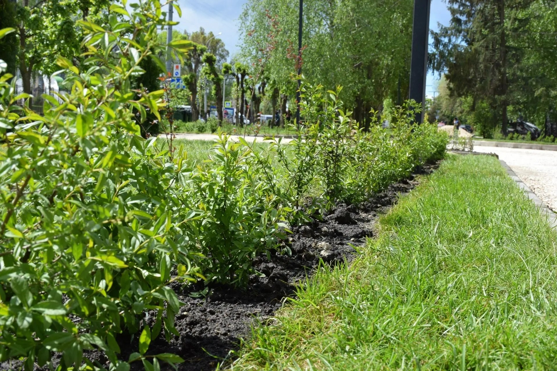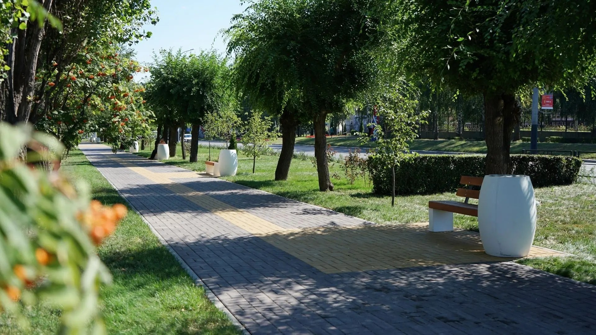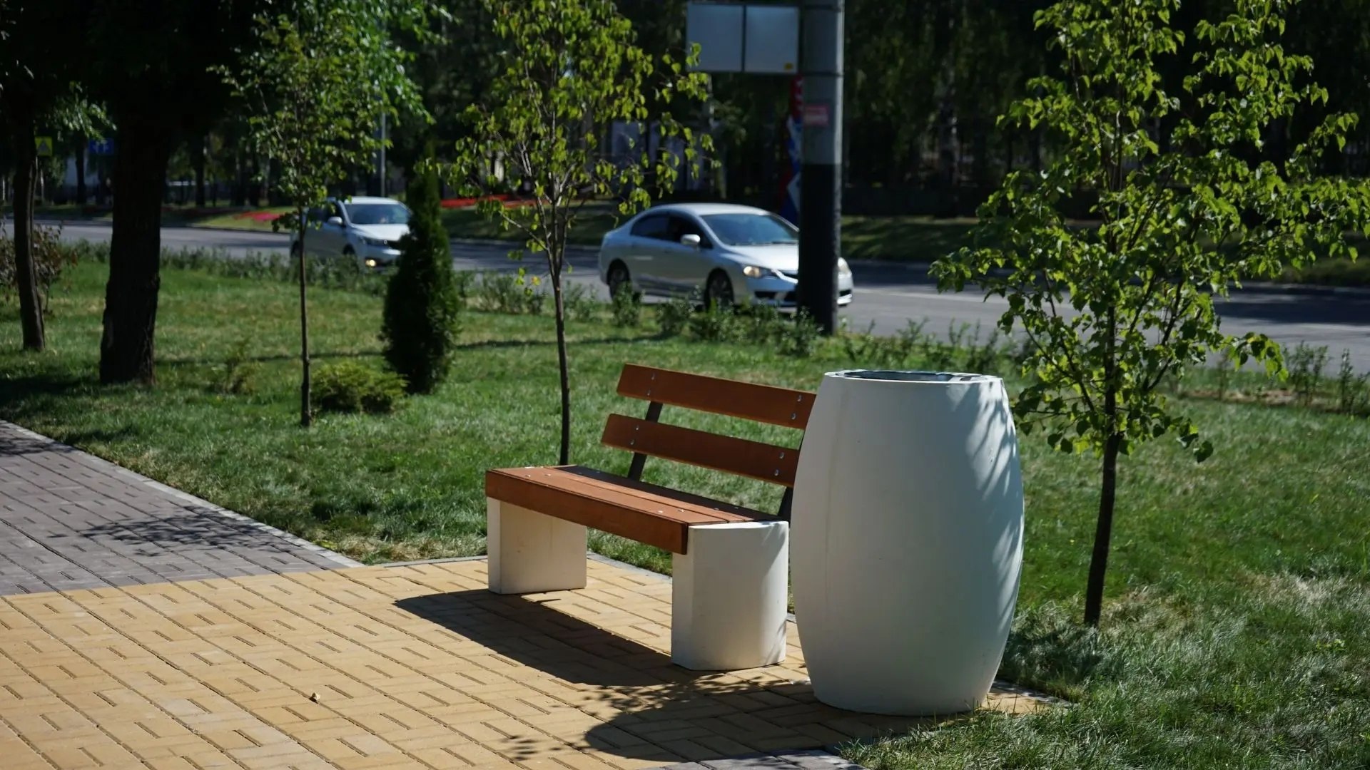 Особое внимание уделили озеленению: уложили газонный рулон, высадили почти сотню молодых деревьев - лип, пирамидальных тополей, берёз. Ландшафтный дизайн дополнили туи, можжевельник и более 1500 кустарников. Для отдыха установили 14 скамеек в стиле минимализма из бетона и древесины, а также 14 необычных урн. Пешеходную зону от проезжей части отделяет 151 секция ограждения, а вдоль частных домов заасфальтировали тротуар — это была просьба жителей.