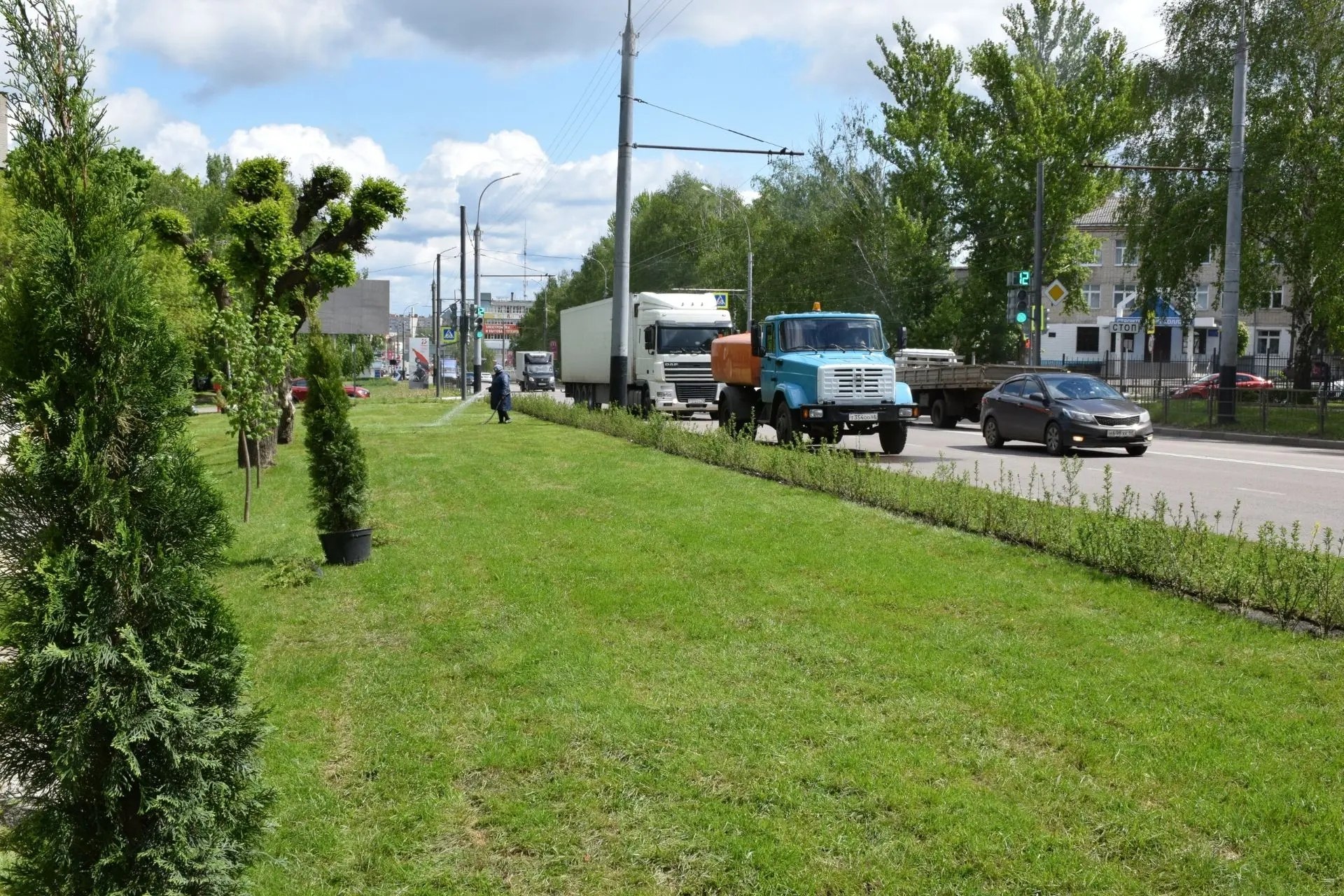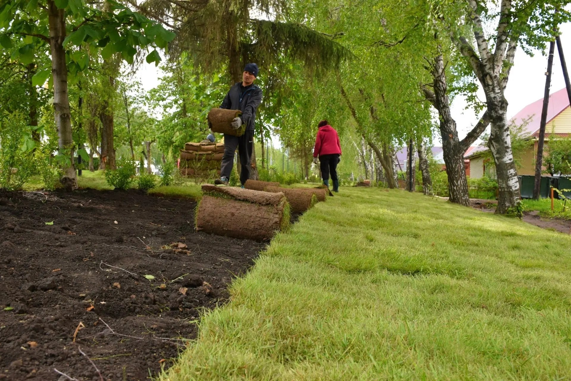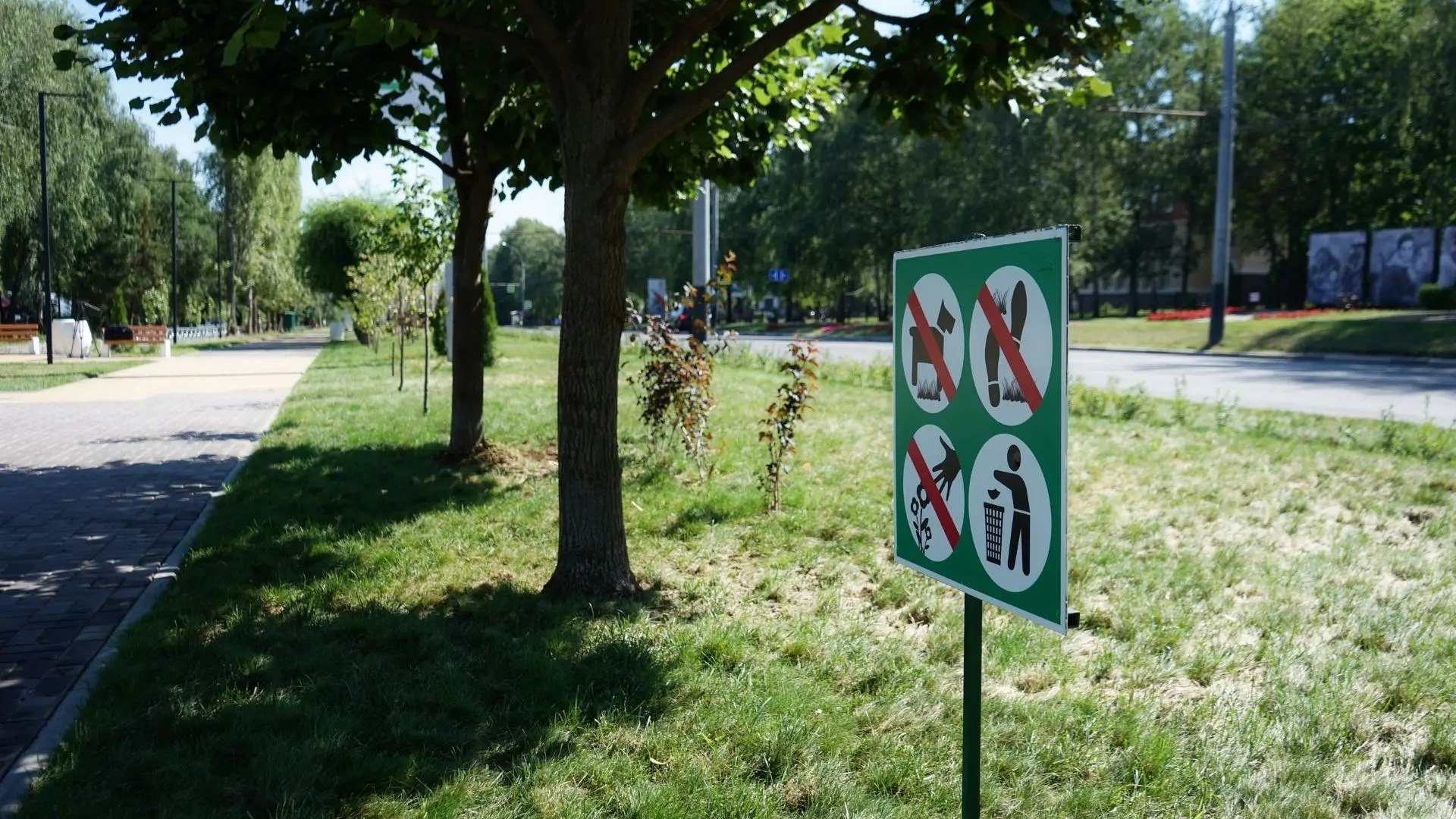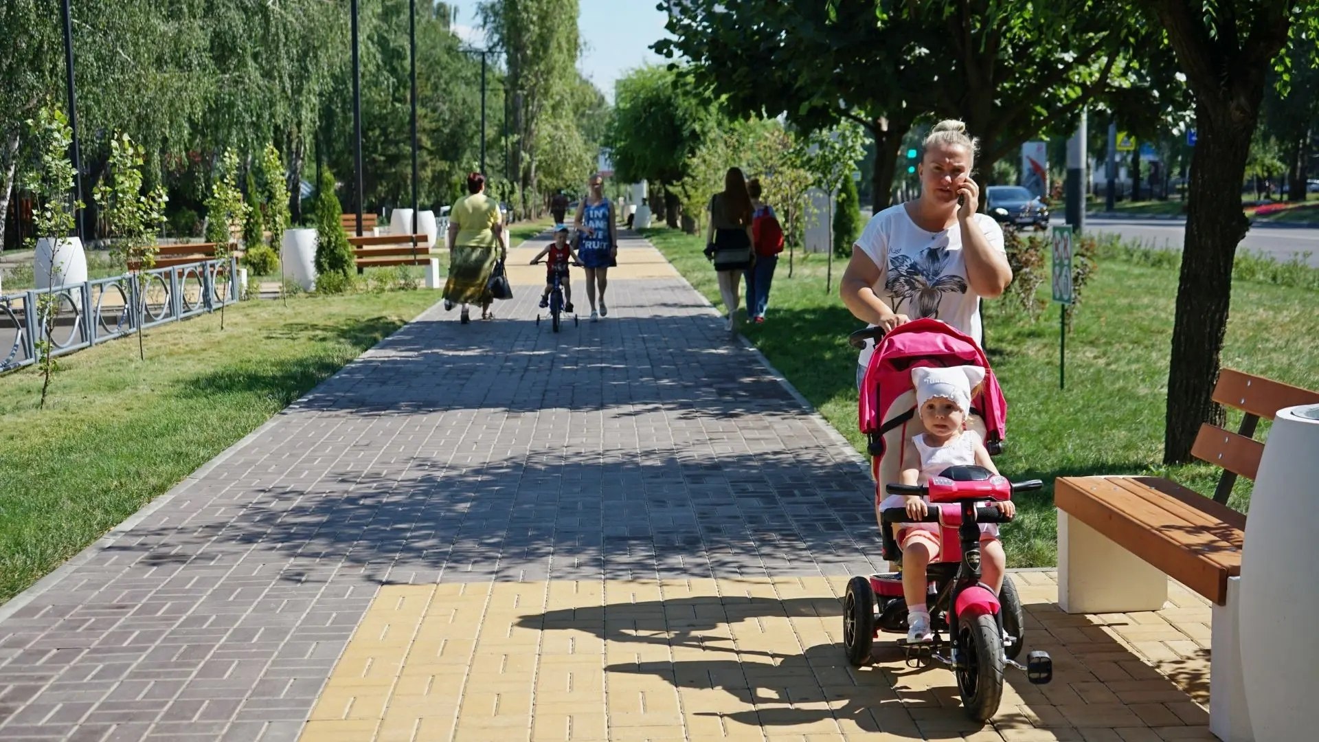Особое внимание уделили озеленению: уложили газонный рулон, высадили почти сотню молодых деревьев - лип, пирамидальных тополей, берёз. Ландшафтный дизайн дополнили туи, можжевельник и более 1500 кустарников. Для отдыха установили 14 скамеек в стиле минимализма из бетона и древесины, а также 14 необычных урн. Пешеходную зону от проезжей части отделяет 151 секция ограждения, а вдоль частных домов заасфальтировали тротуар — это была просьба жителей.