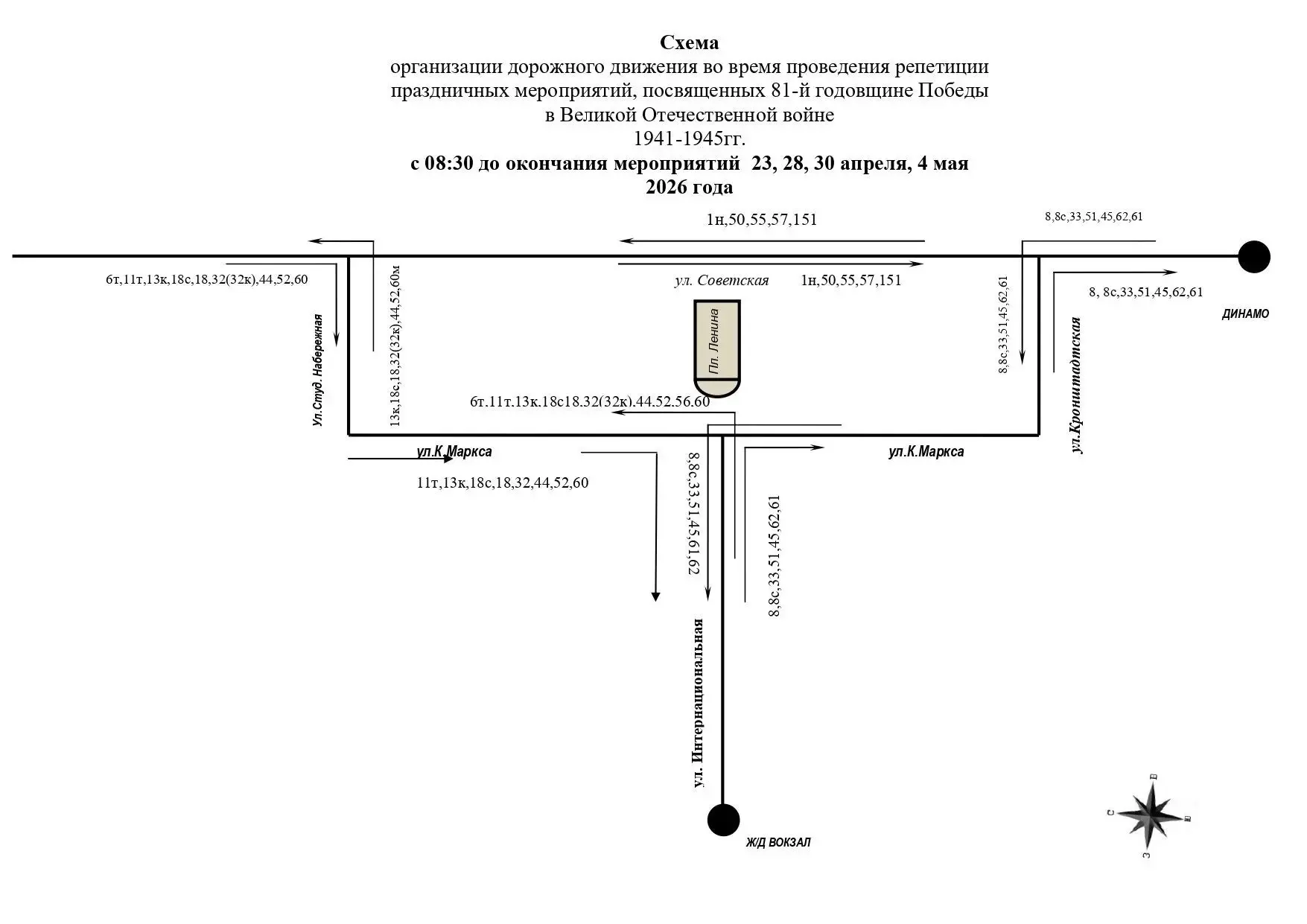 В это время центр города перекроют для движения транспорта и запретят его остановку. Ограничения будут действовать на улице Интернациональной, на участке от Советской до Карла Маркса, и непосредственно на площади Ленина. С 7-ми часов утра запретят остановку, а с 8:30 - движение транспорта.