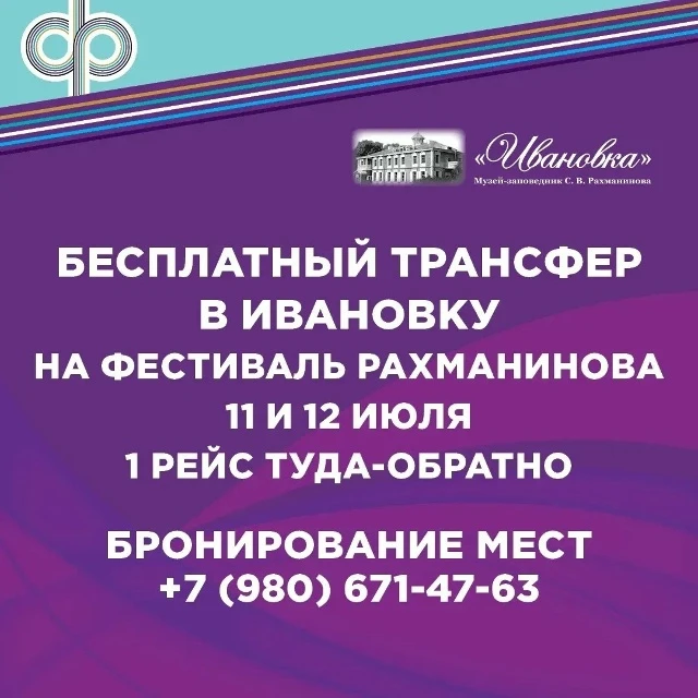 11 и 12 июля бесплатный трансфер отправится до Музеязаповедника С.В. Рахманинова в Ивановке. Услуга предоставляется при наличии билета на летний сезон Международного фестиваля имени С.В. Рахманинова. Для бронирования места в автобусе необходимо позвонить по телефону: 8 980 671 47 63.